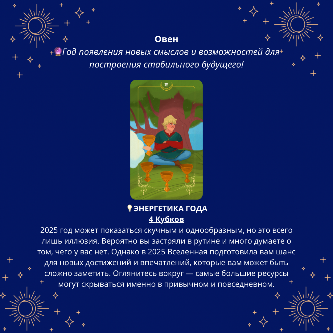 Год только начался, а значит самое время заглянуть в будущее, чтобы понять, какие возможности ждут нас! Этот прогноз станет особенно полезен тем, кто стремится прожить 2025 год осознанно, принимать правильные решения, видеть скрытые возможности и понимать, куда направить свои усилия. Даже если вы не являетесь знатоком Таро эти подсказки и советы подойдут каждому, кто готов впустить в свою жизнь немного магии и осмысленности. Карты Таро помогут лучше понять себя и окружающий мир, ведь это способ подключиться к своим внутренним ресурсам и быть готовым к любым поворотам судьбы. Какой-то знак зодиака найдет мощный заряд вдохновения в 2025 году, кому-то откроется возможность избавиться от старых привычек, а кто-то узнает как укрепить свое материальное положение. Готовы узнать, что ждет вас? Тогда давайте посмотрим, что карты предсказали вашему знаку! Продолжение опубликуем совсем скоро… Поделитесь постом со своими близкими, чтобы они не пропустили прогноз для себя! Начало года — идеальное в