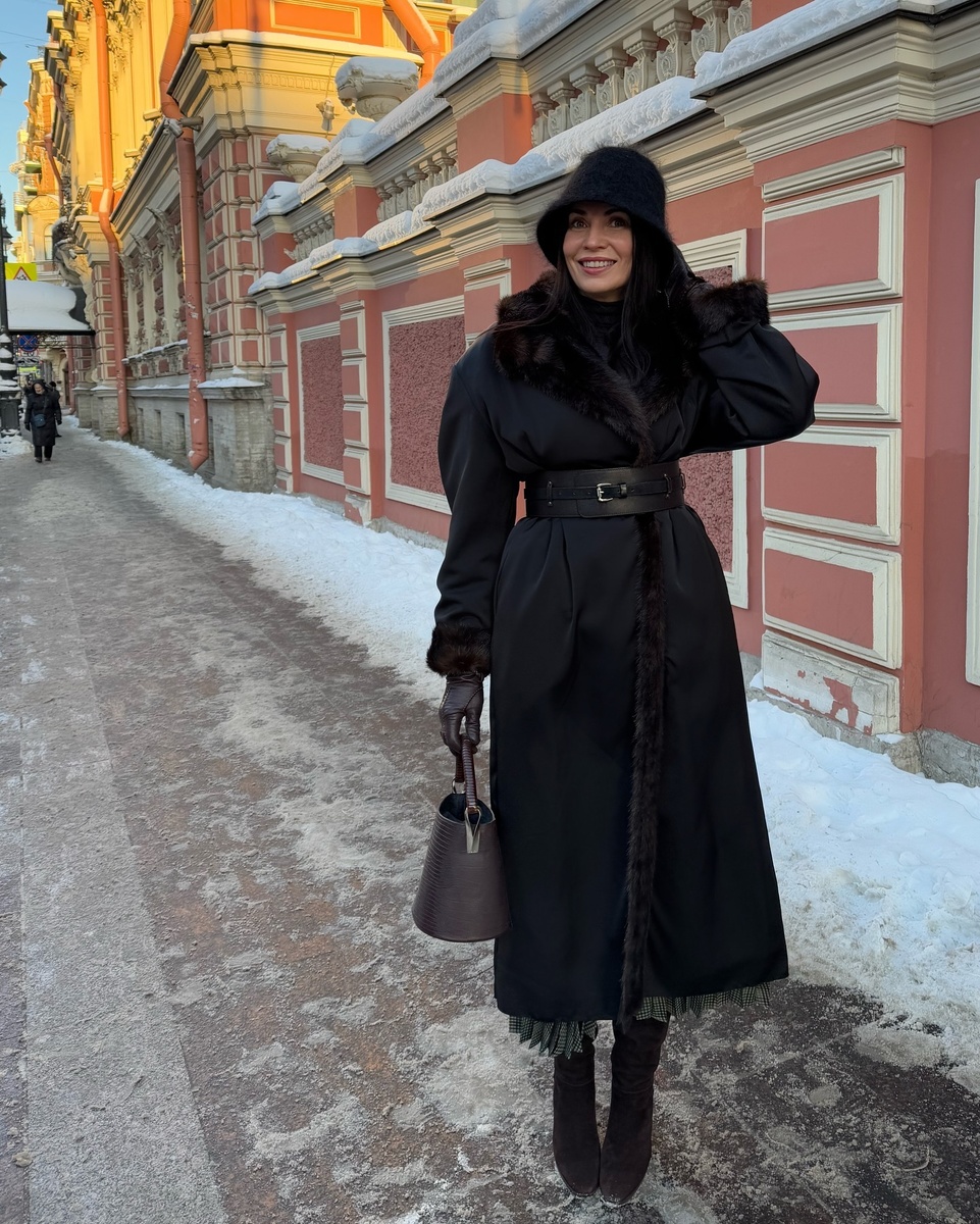Все чаще дизайнеры украшают верхнюю одежду меховыми элементами, которые добавляют образу эффектную нотку. С помощью широкого кожаного пояса блогер выгодно подчеркнула талию, создала гармоничный и утонченный силуэт.