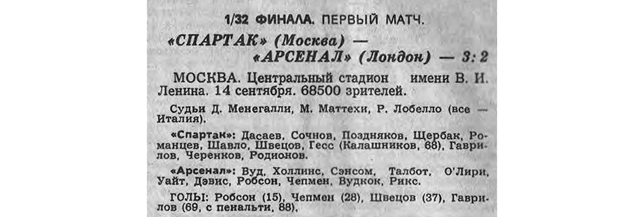 Читаем С-Э «Спартак» отправился в Англию в конце сентября 1982 года. Команде, возглавляемой Константином Бесковым и ведомой капитаном Олегом Романцевым, предстояло биться с «Арсеналом» в ответном матче 1/32 финала Кубка УЕФА.