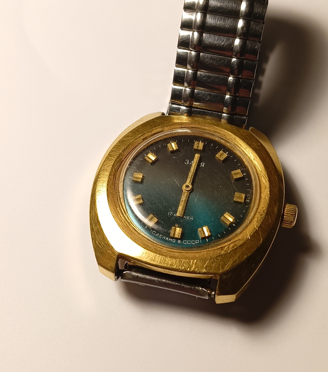 Доброго времени суток! Сегодня буду ремонтировать часы Заря в позолоченном корпусе. Часы сделаны в СССР, примерно в конце 80-х - начале 90-х гг. Задняя крышка зачётная - со знаком качества СССР. Окрутил кольцо и снял крышку. Снял защитный кожух. Механизм в нормальном состоянии, спираль баланса подверглась вмешательству - спираль согнута. Ну чем же она так манит людей, что сразу начинают её бедную гнуть))) Снял распорное кольцо и извлёк механизм из корпуса. Как видно, секундная стрелка отсутствует, на циферблате царапины - часы ранее бывали в ремонте. Снял стрелки и циферблат - циферблат очень красивый, с переходом цвета, но вот качество краски не очень, малейшее прикосновение может нарушить покрытие. Разбираю механизм для мойки. Сразу решил найти баланс, хорошо когда есть доноры. Нашёл исправный баланс примерно тех же годов выпуска. Промыл все детали в бензине и собираю, смазываю цапфы правильным маслом. Не забыл помыть и смазать пружину. Камни баланса также обязательно смазываются мас