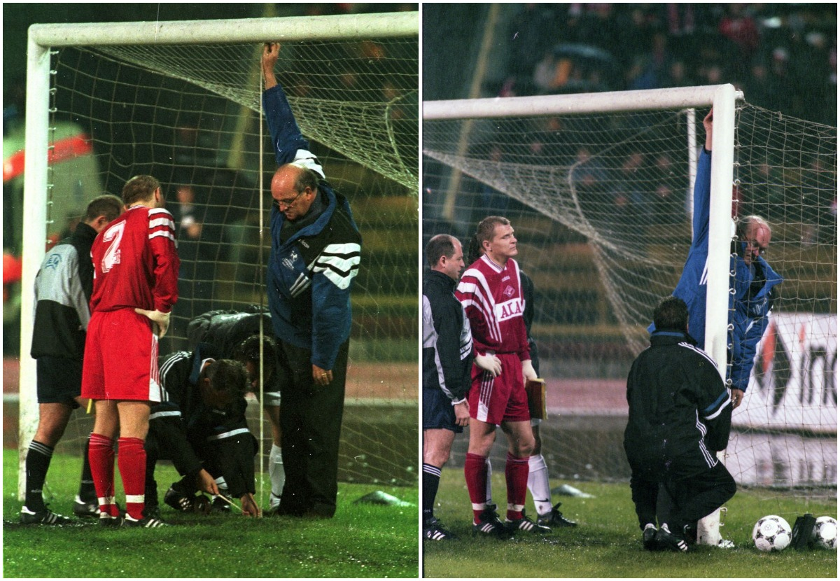 "Спартак" - "Сьон" (Швейцария) 5:1 15.10.1997. 1/32 финала Кубка УЕФА, второй матч (первый - 1:0). Состав "Спартака": Филимонов, Горлукович, Евсеев, Ромащенко, Ананко (Головской, 85), Аленичев, Титов, Тихонов, Бузникин (Мелешин, 65), Ширко (Цымбаларь, 46), Кечинов. Голы: Бузникин (5), Титов (34), Кечинов (42), Тихонов (60), Камадини (66), Ромащенко (84). А началась эта история 30 сентября 1997 года. Когда оставалось 10 минут до выхода команд на поле, начали происходить удивительные вещи: Французский рефери Коломбо, вместо того чтобы вывести команды на поле, отправился… измерять ворота рулеткой. Компанию ему составили итальянский делегат встречи Казарин и два капитана. Интересно, что сами замеры ворот были сделаны рулеткой, что нельзя делать по правилам УЕФА, замеры высоты делаются только шестом высотой 2,44 метра. Но на стадионе "Локомотив" не было никакого шеста, а была рулетка в подсобном помещении. В итоге после совещаний с Уефа, комиссар матча дал разрешение на начала матча. Кото
