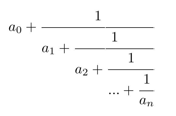 ,где a₀, a₁, ..., aₙ - целые числа; a₁ ≥ 1, a₂ ≥ 1, ... aₙ₋₁ ≥1, aₙ > 1. При этом числа a₀, a₁, ..., aₙ неполными частными или элементами цепной дроби, n - длиной цепной дроби.