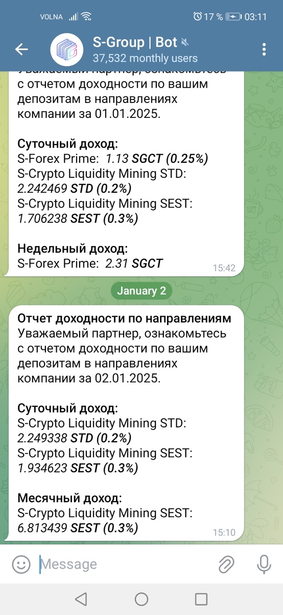 01.01.2025: std = 2.242469 (22.42 руб) sest = 1.706238 (211.57 руб) sgct = 1.13 (117.52 руб) Итого: 351.52 руб 02.01.2025: std = 2.249338 (22.49 руб) sest = 1.934623 (239.89 руб) sgct = 0 (торги на Форексе не проводились) Итого: 262.39 руб Итого за 2 дня: 613.90 руб Недельный доход sgct 2.31 (240.24 руб) и месячный доход 6.813439 (844.87 руб) оставляю пока на балансе, для реинвеста в конце месяца Праздники проходят в кругу семьи и друзей, а доходы приходят каждый день и приближают меня к моим целям!