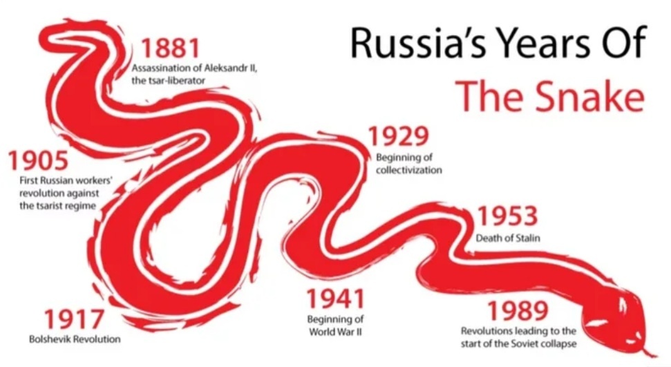На одном из западных форумов кто-то выложил картинку, на которой показаны все наиболее трагические события в недавней истории России, случившиеся в Год Змеи. Вот эту: Я вам предлагаю посмотреть, с каким упоением западная публика обсасывала свои надежды и мечтания на то, что начавшийся 2025 год (год змеи) также станет для нас с вами не мене трагическим. Что еще взять с упырей? ***************** nenes_husband 1941 год как начало Второй мировой войны? Для страны, которая была вовлечена в это с тех пор, как вторглась в Польшу в сентябре 39-го? Ага, русская история) до 41 года войны не было))) сакулремада ruSSiasses живут в постоянной лжи. пандаваффи «Великая Отечественная война». Термин, придуманный русскими, чтобы скрыть свое соучастие в начале Второй мировой войны. ангмарец 1941 - не начало Второй мировой войны. Это начало того, что ruzzky называет "великой отечественной войной". По сути, год, когда ruzzky вошел в фазу "узнавания" плодов нацистско-советской дружбы. рейнджер024 Россия все