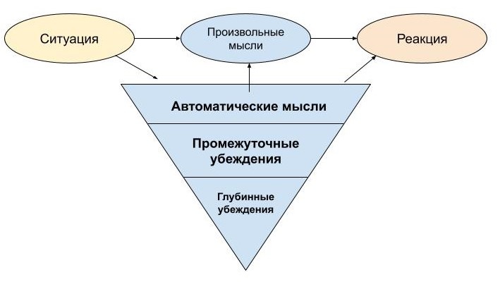 Ниже вы видите общее представление когнитивной модели. Она гласит, что нашу реакцию вызывает не сама ситуация, а наше восприятие и интерпретация этой ситуации. Интерпретация у нас, как правило, доведена до автоматизма, и чтобы дать оценку нам необходима пара секунд. И хоба - пара секунд, и мы уже на эмоциональном дне.