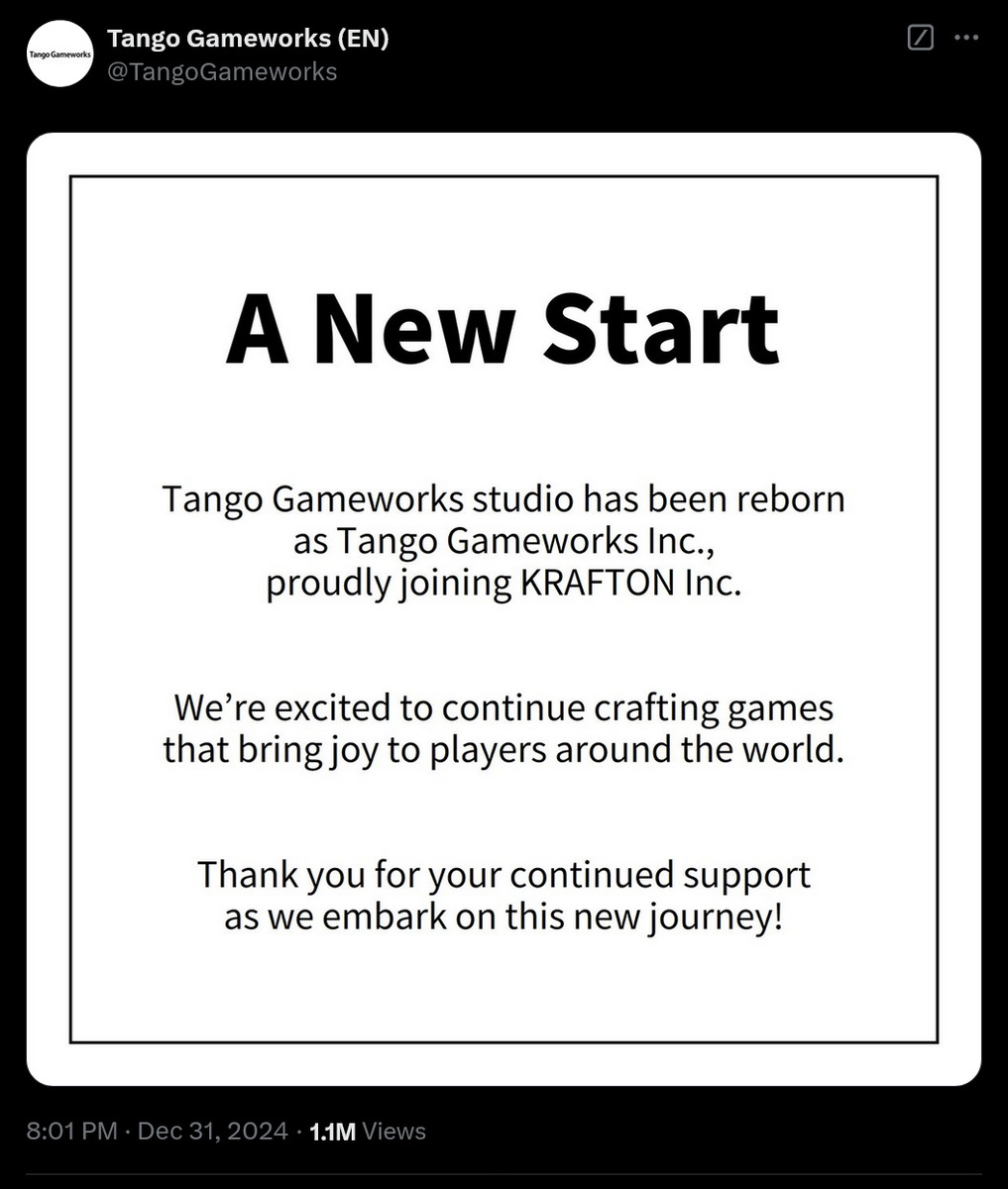 Tango Gameworks, известная по игре Hi-Fi Rush, официально возобновила свою деятельность менее чем через год после того, как Microsoft закрыла ее. Студия, теперь принадлежащая компании Krafton, объявила о "новом старте" в своем первом сообщении после неожиданного закрытия в мае 2024 года. Студия Tango Gameworks возродилась как Tango Gameworks Inc и с гордостью присоединяется к Krafton Inc. Мы рады продолжить создавать игры, которые приносят радость игрокам по всему миру. Поглощение Tango компанией Krafton было анонсировано в августе 2024 года, вскоре после шокирующего закрытия. Решение удивило многих, учитывая, что годом ранее вице-президент Microsoft Аарон Гринберг назвал Hi-Fi Rush "прорывным хитом, превзошедшим все ключевые показатели и ожидания". Microsoft так и не пояснила причины закрытия Tango, которая помимо Hi-Fi Rush создала The Evil Within и Ghostwire: Tokyo. Вероятно, финансовые показатели сыграли решающую роль, хотя закрытие престижной студии вскоре после публичных похвал н