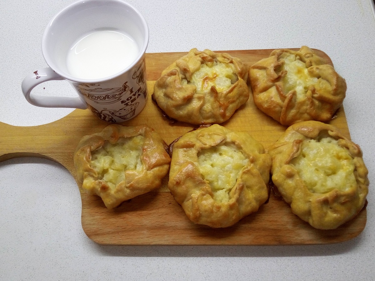Ингредиенты : Для теста: Мука - 200 г. Кефир -100 г. Соль по вкусу Начинка: Картофель - 4 шт. Молоко -100 мл. Масло сливочное -100 г. Соль по вкусу Для смазывания: Сметана - 2 ст.л. Масло сливочное - 40 г. Почистите и сварите картофель. За пять минут до готовности добавьте соль. Воду слейте. Добавьте в горячий картофель сливочное масло, слегка разомните. Влейте горячее молоко. Затем полностью остудите пюре. Насыпьте муку в миску, добавьте соль, перемешайте. Влейте кефир, замесите тесто. Это легко сделать сразу рукой, тесто довольно быстро соберется в комок, его не надо долго вымешивать. Скатайте из теста колбаску, разрежьте ее на кусочки величиной с грецкий орех. Положите кусочки в миску, накройте ее пленкой, чтобы тесто не засохло. На доску насыпьте немного муки. Возьмите один кусочек теста, разомните его руками в лепешку. Раскатайте ее скалкой в круг, диаметром около 10-12 см. Тесто раскатывается очень легко, не рвется, при этом оно получается очень тонким. Выложите на кружки