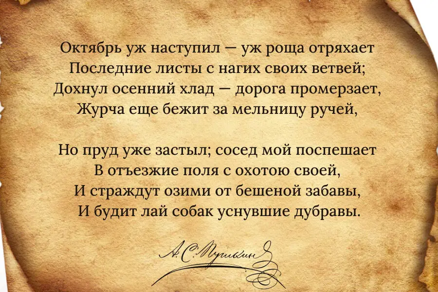 “Октябрь уж наступил…” — о, как полны эти строки тихой меланхолии и сколь верно они передают то настроение, что охватывает природу в пору её увядания. Вижу пред собою рощи, чьи ветви, оголённые, словно руки, осыпают землю золотой листвою. Этот едва слышный шёпот падающих листьев, ускользающий свет ослабевшего солнца, пробуждающий грустные думы о времени и его неумолимом