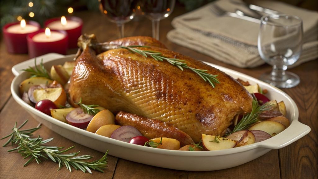 Рождественский гусь – это не просто блюдо, а символ праздника и семейного уюта. С древних времён в Европе, особенно в Германии и Великобритании, гусь считался деликатесом, который подавали на нарядный стол в день зимнего солнцестояния и Рождества. Его запекают с сочной начинкой и подают с гарнирами, создавая неповторимую атмосферу праздника. Для более насыщенного вкуса можно добавить в начинку орехи или сухофрукты.Гуся можно подавать с различными гарнирами, такими как картофельное пюре, тушеная капуста или запеченные овощи.Храните оставшийся гусь в холодильнике не более 2-3 дней, разогревая его перед подачей. Общее время приготовления составляет от 3 до 4 часов, включая подготовку и запекание. Данное блюдо рассчитано на 6-8 порций. Гусь имеет довольно плотное мясо, поэтому его важно правильно замариновать: Маринад сделает мясо мягким, а специи и фрукты добавят аромат. Для достижения сочности мяса и хрустящей корочки следуйте этим шагам: Эти приёмы помогут сохранить мясо сочным, а кожу