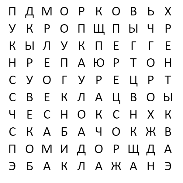 В данной головоломке вам необходимо найти спрятанные слова. Читаются слова только по прямой линии слева направо или сверху вниз.