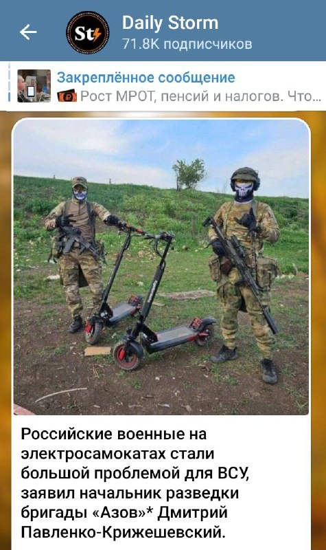Российский телеграмм-канал издания Daily Storm, признанный в соседней Белоруссии экстремистской организацией, приводит высказывания члена террористической и экстремистской организации, запрещенной в России о том, что российские войска на СВО, используя электросамокаты, наносят существенный урон противнику. Данная информация заставляет задуматься. В Санкт-Петербурге губернатор добивается уменьшения электросамокатов на улицах города, а Москве - мэр и его эстонский зам, наоборот делают все, чтобы сконцентрировать электросамокаты в столице. Уж не иностранные ли они агенты?