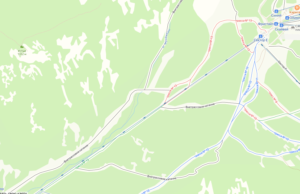 Предыдущая статья из этой серии: Сразу загружаю карту, чтобы вы понимали о какой трассе идет речь. На второй день наших покатушек в феврале 2024 года, мы обкатали весь сектор Е, начав, конечно же с трассы №13. Решив поехать по маршруту с внетрассовым катанием мы немного не туда свернули и случайно нашли очередной красивый вид на курорт. Однако, сам спуск там был не очень безопасным и вообще некомфортным, т.к в том месте слишком много деревьев и делать нам там было нечего, как говорится))) Местами пришлось даже выстегнуться и пройтись пешком, но ничего страшного, т.к. посмотреть вокруг все равно кайфово! Затем мы поняли, что лучше вернуться на трассу и стараться от маршрутов не отклоняться.