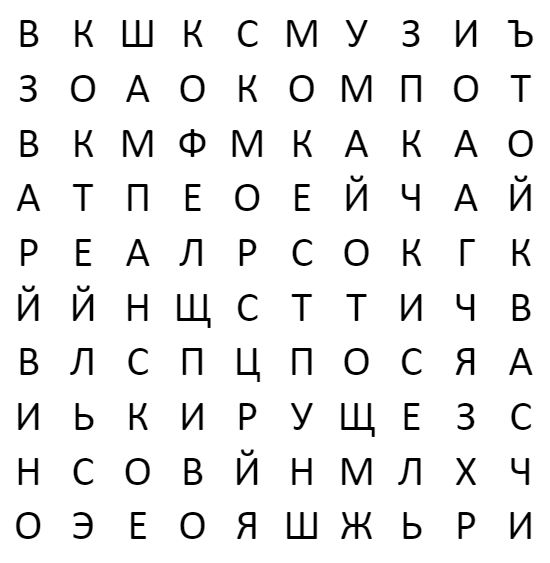 В данной головоломке вам необходимо найти спрятанные слова. Читаются слова только по прямой линии слева направо или сверху вниз.