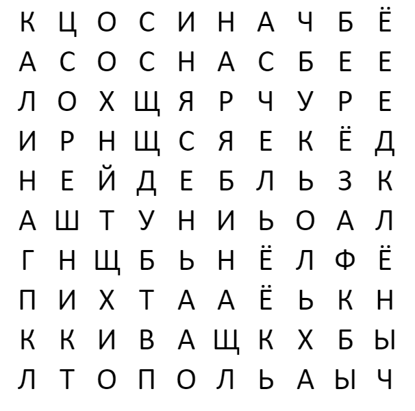 На этом поле спрятаны 15 названий деревьев. Сможете найти их все? Добро пожаловать на мой канал! Каждый день я предлагаю Вам новые логические задачки, чтобы немного расслабиться и переключиться. Думайте, решайте, разгадывайте, пишите ответы в комментариях. * * * В данной головоломке вам необходимо найти спрятанные слова. Читаются слова только по прямой линии слева направо или сверху вниз. Включайте воображение и начинайте искать! * * * Для проверки правильных ответов листайте галерею. Всё получилось найти? Пишите ответы в комментариях 👇🏻👇🏻👇🏻 И заглядывайте в другие головоломки: Найди слова, выпуск 3 Загадки с подвохом, выпуск 5 Задачки со спичками, выпуск 5 Примеры с картинками, выпуск 1 * * *
