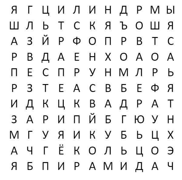 На этом поле спрятаны 15 различных геометрических фигур. Сможете найти их все? Проверьте свои знания в геометрии. Добро пожаловать на мой канал! Каждый день я предлагаю Вам новые логические задачки, чтобы немного расслабиться и переключиться. Думайте, решайте, разгадывайте, пишите ответы в комментариях. * * * В данной головоломке вам необходимо найти спрятанные слова. Читаются слова только по прямой линии слева направо или сверху вниз. Включайте воображение и начинайте искать! * * * Для проверки правильных ответов листайте галерею. Всё получилось найти? Пишите ответы в комментариях 👇🏻👇🏻👇🏻 И заглядывайте в другие головоломки: Ребусы, выпуск 6 Найди слова, выпуск 4 Задачки со спичками, выпуск 7 Лабиринты, выпуск 6 * * *