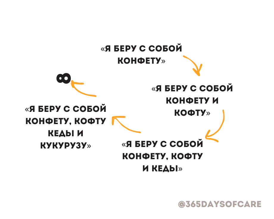 Возвращались после праздника домой, в дороге провели 4 часа. Сыграли с Марком в игру, которая ему на удивление очень понравилась и надолго заняла. Я назвала ее «Чемодан». Первый человек говорит «Мы едем на море, и я беру с собой Х» (вместо Х вставляем любое слово). Второй по очереди полностью повторяет фразу и добавляет второе слово. Добавляем слова, пока кто-то не запутается. Это отличная игра для развития памяти ребенка. Легко играть на прогулке, в дороге или в очереди к врачу. Никакой подготовки, кроме собственной креативности и способности заинтересовать ребенка 🙂 Завела тг-канал, где буду публиковать больше игр и разнообразных идей. Чтобы не пропускать посты, подписывайтесь ✅ Вы можете стать моим первым подписчиком :)