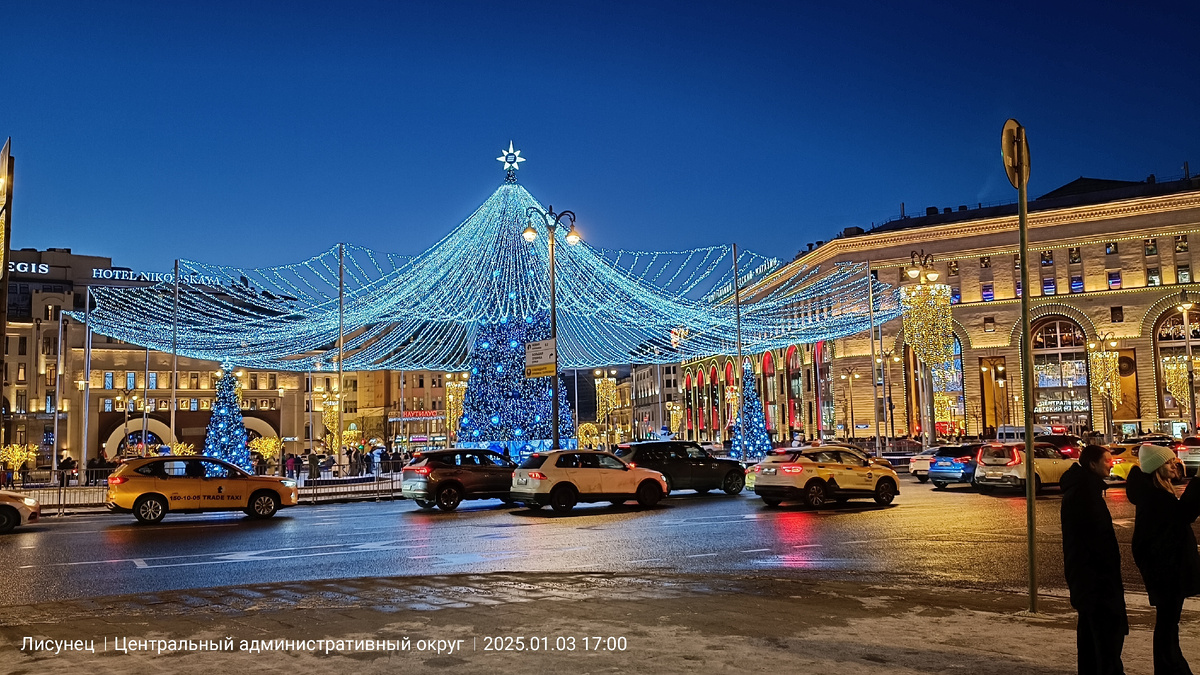 Захотелось прогуляться по зимней Москве. Давно собирались. Смотрели разные локации, маршрут составляли. А на самом деле, получилось все спонтанно. После кинотеатра , поехали в Александровский сад. А увидели кучу ограждений, столько же людей. Прогуляться полноценно не получилось, потому что часть сада перегородили и прохода не было. Пришлось опять толкаться, чтоб по лестнице подняться на Манежную. Но и тут все перегорожено. Как стадо, извиняюсь ,баранов, по ограждениям , шли в сторону локации ,, Путешествие в Рождество,,. Везде ,по ограждениям, стоят полицейские. Чтобы пройти , куда мы планировали не реально. Народу больше чем людей. Нужно проходить через рамки, что опять тормозит движение и создает толкотню. Вообщем люди, которые должны были централизовать движение, наоборот сделали хуже. Решили не ходить в эту сторону, а прогуляться до Детского мира. Но и дальше лучше не стало. Не помню такого количества людей на улицах. Не протолкнёшься. Кто с экскурсией, с флажками, кто на Кремл