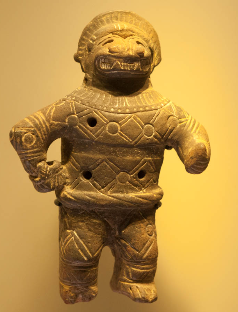 В музее золота в Боготе хранится более 55000 статуэток из золота, платины, серебра. Статуэтка с маской то ли крокодила, то ли ягуара. Племена чибча-муиска, создавшие эти статуэтки, поклонялись богу Солнца. Высунутый язык статуэтки отсылает нас к образу богини-разрушительнице Кали. С этим племенем связана легенда о заветном Эльдорадо. А вот это, чем не будильник? Жрец отвозил золотые статуэтки на середину священного озера и погружал подношения в воду. Затем смывал с себя золотую пыль, которой был осыпан с головы до ног. Вероятно этот обряд произвел неизгладимое впечатление на европейцев. У муисков был свой Кецатлькоатль - Бочика, который учил индейцев жить в добре и справедливости. На скалах он выбил таинственные узоры, которые муиски должны были воспроизводить в качестве орнаментов на тканях. Бочика вступил в схватку со злым богом Чибчакумом, который пытался уничтожить людей с помощью потопа. Бочика победил и заставил Чибчакума держать на плечах землю. Там где золото, там и деньги