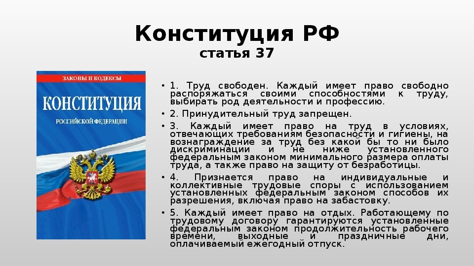 Напомню, - мысль была простая. Россия не ведет войну (по крайней мере - официально), а проводит специальную, пусть и военную, операцию. Это работа. По отстаиванию интересов нашего государства. Необходимая, тяжелая и опасная. Но, как и любая другая работа у нас в стране, - она регламентирована законами в т.ч. главным законом, - конституцией РФ. И там есть статья 37: