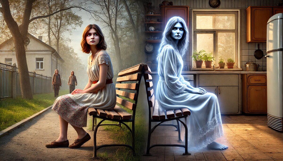 Спустя время Настя вдруг очнулась от странного ощущения: будто кто-то касается её плеча. Она открыла глаза и увидела рядом женщину. На вид лет тридцати пяти, но волосы белые, глаза мерцают. И самое странное — её присутствие было каким-то… эфемерным. Будто полупрозрачным.