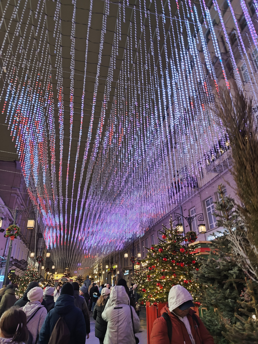 Старший сын подарил мне на Новый год билеты в МХТ им. Чехова. Этот театр - самый любимый в нашей семье, смотрим спектакли там на протяжении многих лет, всегда с большим удовольствием. Но в последнее время походы стали более редкими - цены на билеты стали уж очень кусачими. Вот сынуля и решил сделать плезир - купил билеты на первый ряд партера, сама бы я на такой финансовый подвиг не отважилась. Спектакль называется "Номер 13D". Съёмка спектакля запрещена, поэтому могу показать только интерьеры театра и атмосферу вокруг него. Камергерский переулок ярко украшен, как и весь центр столицы, ведь сейчас проходит фестиваль "Зима в Москве". Над улицей установлена световая инсталляция в виде голубого дождя. Хотя и настоящий дождь тоже идёт - вот такая получается зима, и это который год подряд. Пространство переулка украшают живые ёлки с яркими красными шарами... ... или причудливые неоновые деревья с развесистой кроной. Со стороны Тверской на входе в Камергерский переулок установлена световая