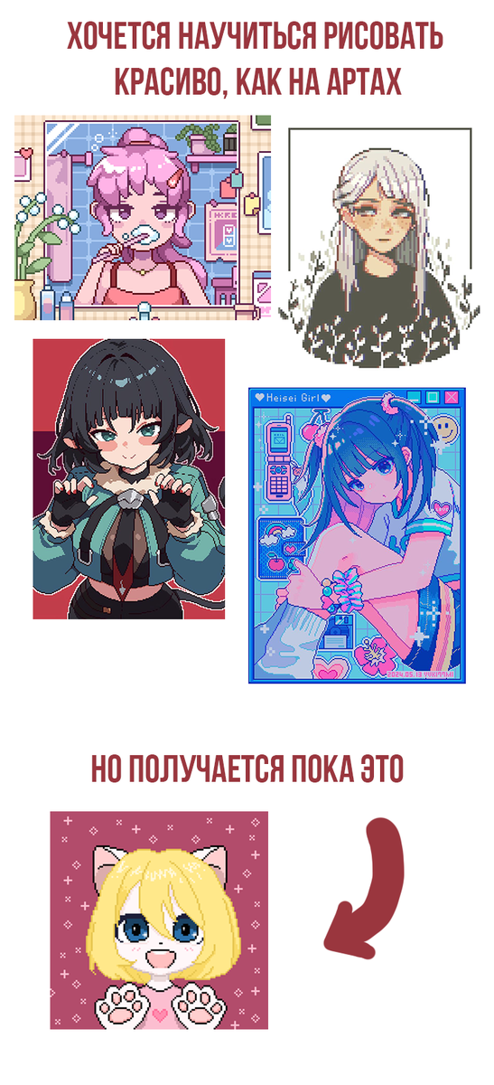 Когда я смотрю на невероятно красивые работы других художников, таких как те, что на этом коллаже, я ощущаю вдохновение и мотивацию. Это то, к чему стремлюсь! Но реальность пока немного другая. Мои первые работы выглядят намного проще и местами наивно, но именно с этого начинается каждый путь. Каждый мастер когда-то был новичком, и я верю, что с каждым новым рисунком мои навыки будут расти. Делая шаг за шагом, изучая техники, пробую разные стили и экспериментирую с цветами и формами. Хотя должна признаться, моя слабая сторона в рисовании — это подбор цвета и света-тени. Пиксель-арт — это процесс, который требует терпения и времени. Даже если сейчас мои рисунки выглядят не так, как я себе представляю, я знаю: если продолжу работать, однажды я смогу рисовать так же красиво, как те художники, которыми восхищаюсь.