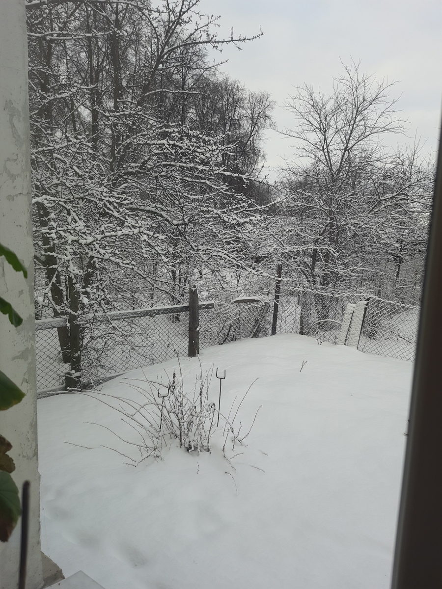 У нас вчера была оттепель, а сегодня примораживать начало. С утра снег шёл. Сфотографировала мамин огород в снегу.