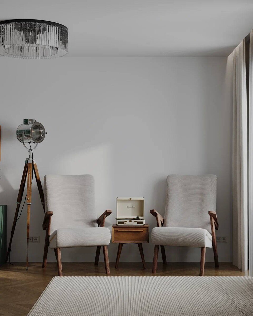 Винтажные кресла рядом с современными светильниками — тренд нового времени. Добавьте декоративные ковры с геометрическими узорами, чтобы подчеркнуть переход между эпохами.
