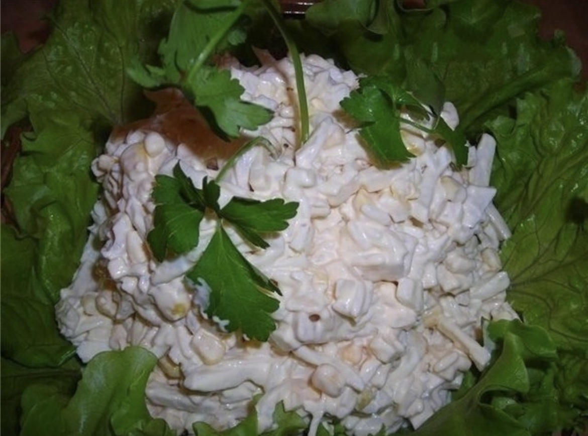 Ингредиенты: сыр-100гр. кальмары-600гр. рис-100гр. кукуруза-1банка яйца-3шт. половинка лимона майонез соль по вкусу листья салата петрушка для украшения Приготовление: Кальмары почистить и отварить 3-5минут, рис и яйца сварить. Нарезать кальмаров, сыр и яйца соломкой. К ним добавить отварной рис, кукурузу.Всё сбрызнуть соком из половины лимона, добавить майонез и соль по вкусу. Всё перемешать. В салатницу выложить листья салата, сверху выложить салат горочкой и украсить по своему желанию. Приятного аппетита 😋