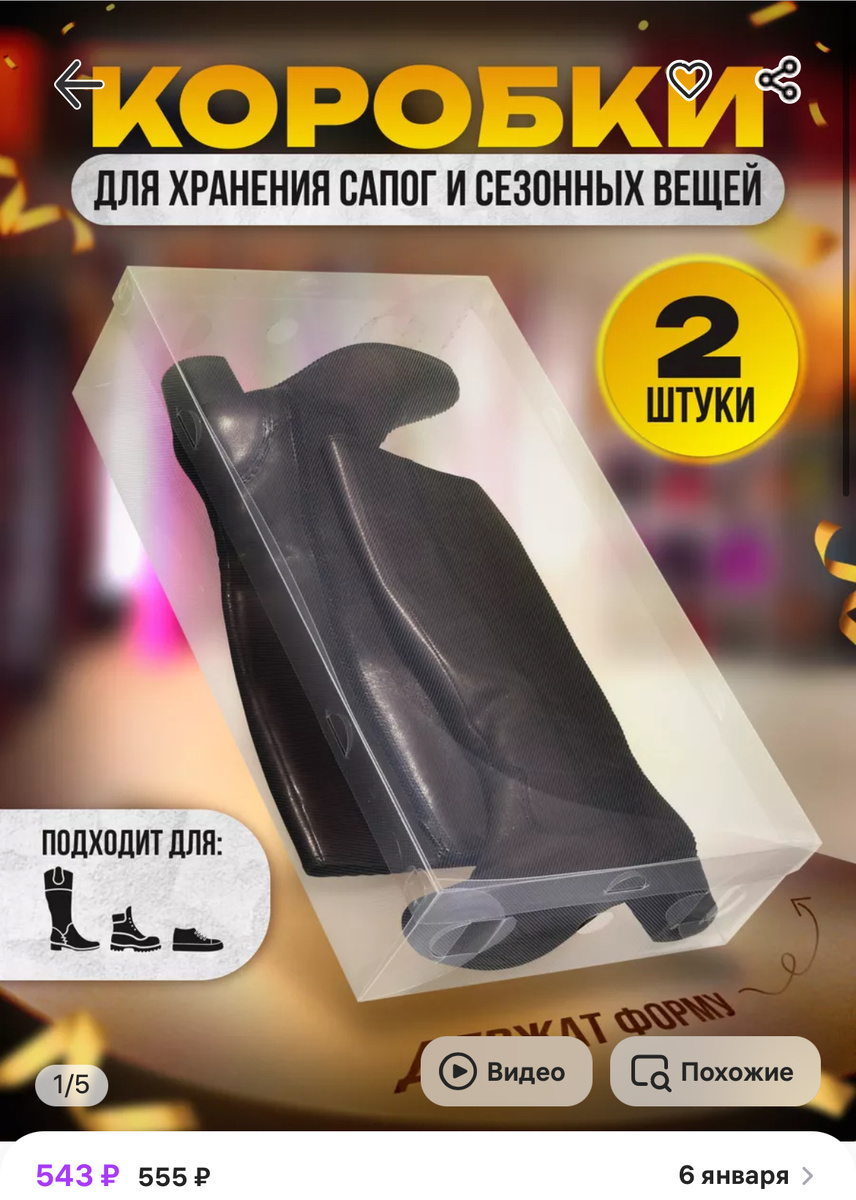Всегда хранила обувь в «родных» коробках и думала, что так делают все. Возможно я считаю, вариант удобным, т.к. у нас не так много обуви и почти все пары от разных производителей. Компактно и аккуратно укладываю коробки на полках в шкафу и без проблем нахожу, что мне нужно. На днях узнала, что многие люди уже давно отказались от коробок в которых продавалась обувь (такие коробки выбрасывают в первый же день) и хранят обувь, которая ждет своего сезона в специальных/эстетичных/практичных коробках для обуви. Самым популярным вариантом, оказались - пластиковые, с прозрачными стенками (чтобы сразу видеть, что внутри). Второе место у тех, что из ткани. В них хранят сразу по несколько пар, такой вариант экономит место. От своего варианта хранения пока не готова отказаться, но подборку специальных коробов для хранения обуви сделала. Вдруг в будущем пригодится. 😉 Арт.179641437 Вариант для хранения сапог, рейтинг 4,9, крепкие, прозрачные, по отзывам отличные. Некоторые хранят в них не сапо