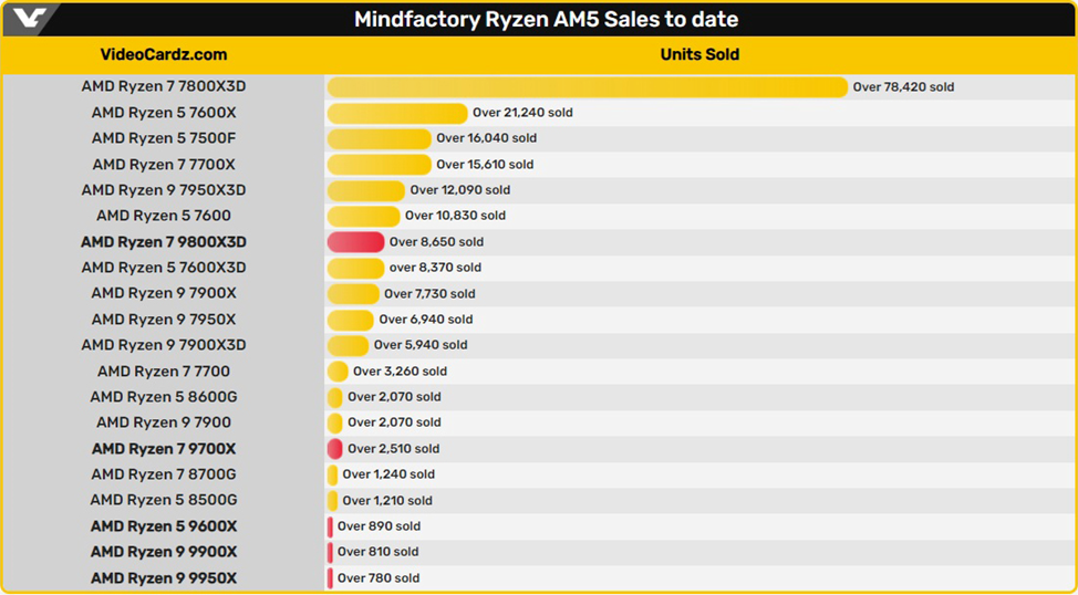 Как сообщает популярный ресурс VideoCardz, по данным крупного немецкого ритейлера Mindfactory, процессор AMD Ryzen 7 9800X3D продается лучше, чем все CPU Ryzen 9000 без дополнительного 3D-кэша вместе взятые. В настоящий момент торговой сети удалось реализовать порядка 8650 единиц Ryzen 7 9800X3D. Это далеко не рекорд — Ryzen 7 7800X3D за все время магазин продал почти 80 000 штук. В целом же, судя по статистике Mindfactory, немецкие пользователи предпочитают приобретать сравнительно доступные шестиядерные и восьмиядерные CPU.