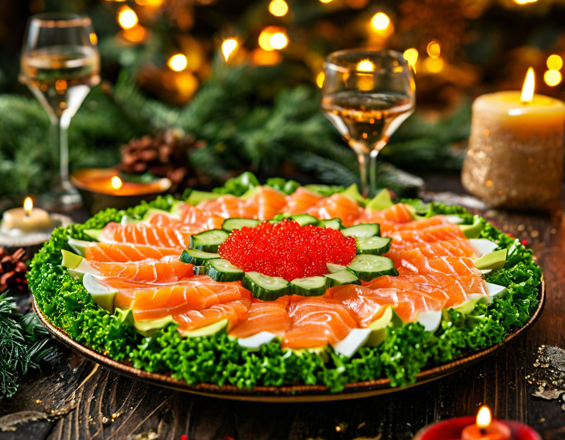 Салат «Рождественская звезда» с копченым лососем: праздничная красота и потрясающий вкус! Когда наступают праздничные дни, хочется удивить близких не только вкусными блюдами, но и красивыми кулинарными изысками. Один из таких вариантов — салат «Рождественская звезда» с копченым лососем, который станет не только вкусным дополнением к вашему столу, но и настоящим украшением, создавая атмосферу уюта и праздника. Почему стоит выбрать этот салат? Этот салат привлекает внимание сразу несколькими факторами: Ингредиенты для салата: Для приготовления вам понадобятся: Как приготовить салат «Рождественская звезда» Шаг 1: Сверху на листья салата аккуратно выложите нарезанные ингредиенты, чередуя лосось, яйца, авокадо и огурцы. Выложите их так, чтобы салат напоминал рождественскую звезду (или другую праздничную фигуру). Шаг 2: На плоской тарелке разложите листья салата Шаг 3: Сверху на листья салата аккуратно выложите нарезанные ингредиенты, чередуя лосось, яйца, авокадо и огурцы. Выложите их та