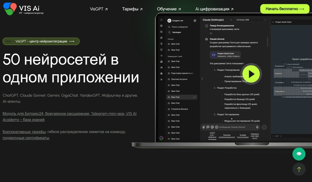 VisGPT — прогрессивное расширение от VIS.center, российской компании с более чем десятилетним опытом в разработке ИТ-решений для бизнеса. Оно предоставляет доступ к новейшим моделям ИИ, позволяя интегрировать более 30 мощных нейронных сетей, таких как ChatGPT, Claude Sonnet, Gemma, GigaChat и YandexGPT, в одном приложении. Мгновенный доступ к ИИ С VisGPT вы можете параллельно выдавать задания различным моделям, мгновенно выбирая оптимальное решение. Простота интерфейса, поддержка многочатовости обеспечивают удобство работы. Оптимизация процессов Задачи решаются всего за 30 секунд. Просто задайте вопрос или опишите задачу, и получайте множественные ответы от разных ИИ. Этот метод значительно ускоряет процесс и существенно повышает производительность, особенно в рамках оперативных решений. Настраиваемая библиотека промптов VisGPT предлагает заранее подготовленную библиотеку промптов для комфортной работы с нейросетями. Все необходимые шаблоны уже доступны, что экономит ваше время на созд