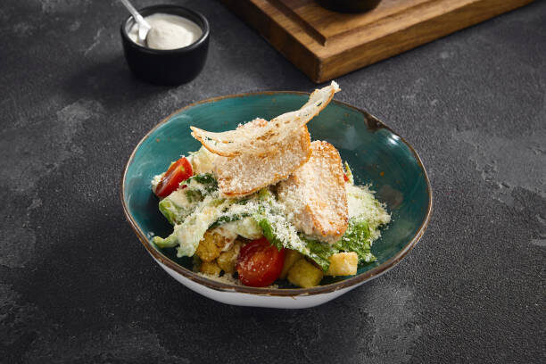 Добрый день. Уважаемые читатели. За свою долгою карьеру поваром я узнал много разных вкусных ресторанных рецептов разных кухонь мира и хочу на своем канале поделиться ими с Вами. А начну я с простого всем известного салата Цезарь, который прост и быстр в приготовлении. И так для его приготовления нам понадобится взять салат айсберг или романо. Я предпочитаю романо так салат выглядит более пышнее и красивее. Берем глубокую посуду и нарываем туда крупными частями салат предварительно помыв его. Далее добавляем соус Цезарь. Существует много рецептов этого соуса и в разных заведениях его делают по разному. Сейчас я поделюсь одним из них который легко приготовить дома. Ведь основной вкус блюду придает соус. Для его приготовления нам нужно: смешать в емкости Майонез-700г Сыр творожный-200г Каперсы-20г Чеснок-10г Анчоусы или рыбный соус-15г Перец черный молотый-2г Горчица зернистая-10г Горчица русская-10г Все это смешиваем и пробиваем блендером Получаем выход на 1 кг на 1 порцию мы берем 40