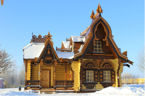 Местный мастер резчик по дереву Евгений Смирнов украсил окна наличниками, вдоль крыши протянулись ажурные причелины и надзоры, с углов свисали деревянные полотенца, а крышу украсили резные кони.