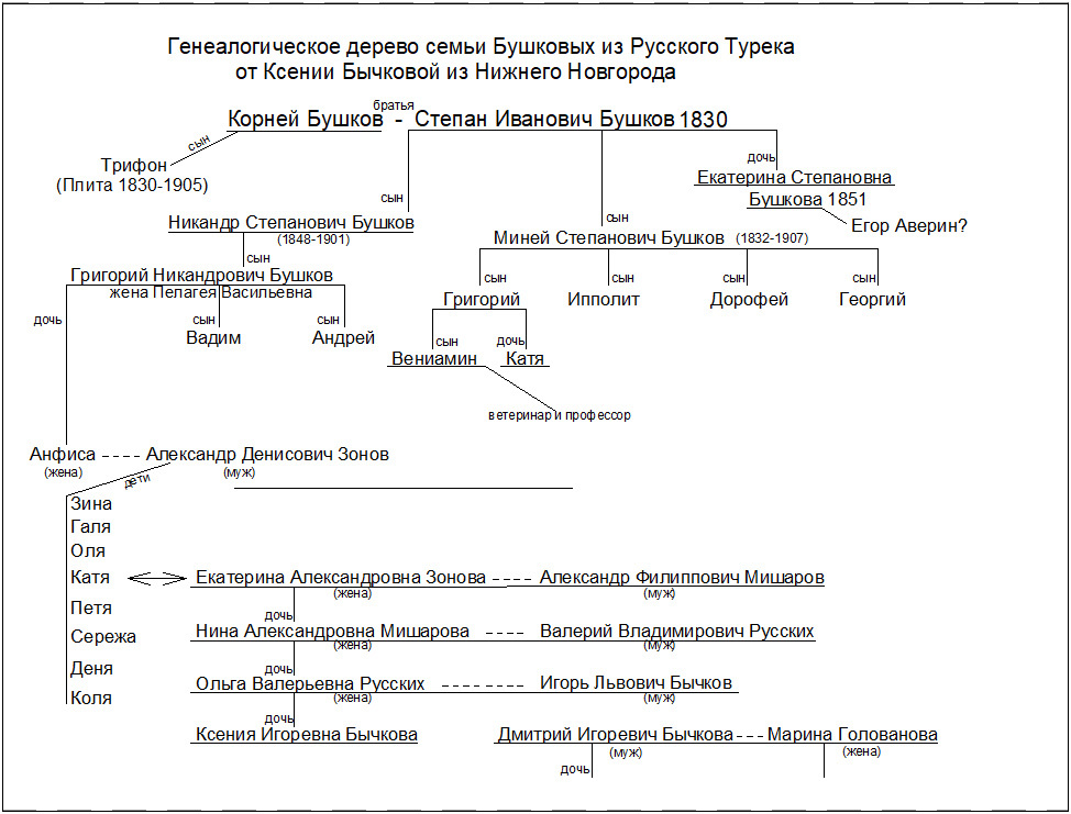 В социальной сети ВКонтакте любезно откликнулась на моём аккаунте прямой потомок Главы лесопромышленной фирмы из Русского Турека Бушкова Григория Никандровича - Ольга Валерьевна Русских. Она прямой потомок ГН по линии его дочери - Анфии Григорьевны Бушковой-Зоновой. Ольга Валерьевна предоставила дополнительные сведения о семье, сделала ряд важных замечаний по персонажам на старых фотографиях семьи, которые были мною получены из Кирова также от прямых потомков ГН, но по линии его сына Вадима Григорьевича. В советское время контакты этих двух прямых ветвей семьи были очень редкими.