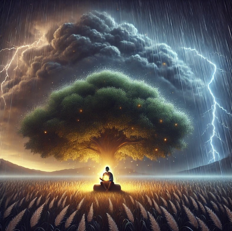 Однажды человек оказался в поле, где разыгрался страшный шторм. Ветер сбивал его с ног, молнии вспыхивали вокруг, и дождь, казалось, пытался проникнуть под кожу. Человек был напуган и не знал, куда бежать. Посреди этого хаоса он заметил огромное дерево с яркими, светящимися листьями. Оно стояло, словно не замечая бури. Человек подошёл ближе и почувствовал, что под кроной дерева всё иначе: там было сухо, тихо, и ветер больше не пытался его унести. Он сел под дерево и заметил, что в его руках появилось маленькое светящееся семечко.