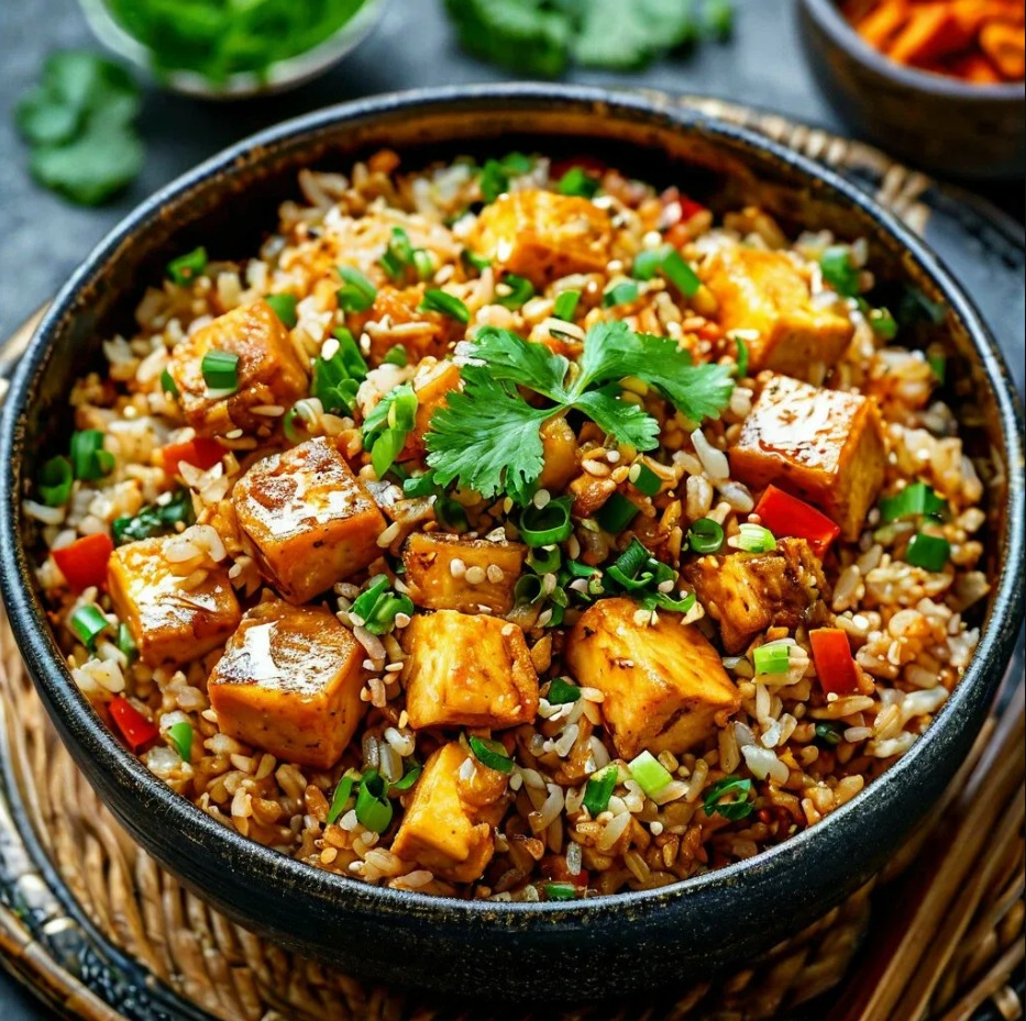 - Подача: Подавайте жареный рис с тофу горячим, украсив нарезанным зеленым луком.