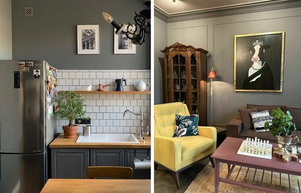 Лена Николаева из Санкт-Петербурга самостоятельно преобразила сталинку 1953 года: героиня сохранила атмосферу и добавила современные решения. Высокие потолки, оригинальные двери и старинный шкаф 1930-х годов стали отправной точкой в дизайне, а винтажные элементы гармонично соседствуют с лаконичной мебелью.