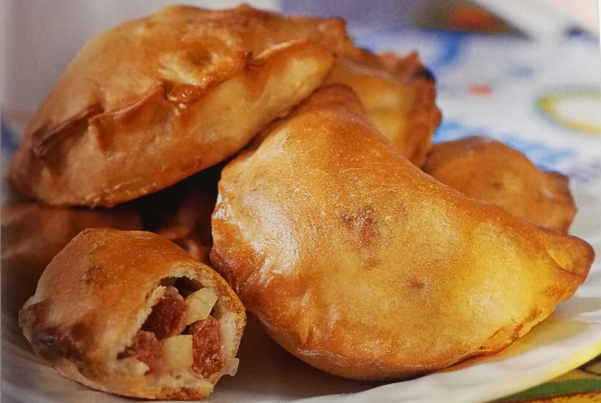 Ингредиенты: - 4 стакана муки - 1 ст. л. разрыхлителя - 1 ч. л. соли Для начинки: - 250 г филе постной говядины - 2 крупные картофелины - 1 луковица - 4 ст. л. мясного или куриного бульона - соль по вкусу - молотый черный перец по вкусу Приготовление: Смешайте муку, разрыхлитель и соль, затем добавьте 6 столовых ложек воды и быстро замесите тесто. Если нужно, подлейте ещё немного холодной воды (до 3 столовых ложек), сформируйте шар и оставьте его в холодильнике на 3 часа. Пока тесто отдыхает, измельчите мясо, нарежьте лук и картофель маленькими кубиками. Всё перемешайте, залейте бульоном, посолите и поперчите по вкусу. Раскатайте тесто до толщины примерно 2 мм и вырежьте круги диаметром около 12 см. Обрезки не используйте повторно, так как тесто станет жёстким. Выложите начинку горкой на каждый круг, брызните сверху молоком. Защипните края теста, формируя полумесяцы, и смажьте верхушки молоком. Выпекайте пирожки 10 минут при температуре 210°C, после чего уменьшите температуру до 170°C