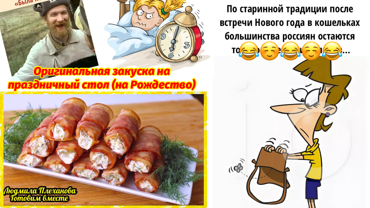— А вы знаете зачем празднуют Старый Новый год? — Наверное, отмечают то, что выжили, празднуя Новый год и Рождество… /анекдот для хорошего настроения/ Хочу предложить вам очень интересную, оригинальную закуску на праздничный стол. Мне очень нравится, что делается это закуска за считанные минуты, а получается очень вкусно, и она очень красиво выглядит на праздничном столе. 🔥 А чтобы приготовление еды не было скучным, в конце публикации и в закреплённом комментарии ⤵️⤵️⤵️ вас ждут весёлые картинки (фотографии) с надписями, которые я сделала сама (используя нейросеть, редактор и другие инструменты), они обязательно поднимут вам настроение Итак начнём Первым делом приготовим 12 трубочек из фольги. Длина трубочки должна быть 10 см, а диаметр 1,5 см. Трубочки у меня полые внутри, чтобы использовать меньше фольги. Теперь берём полоски сырокопчёного бекона и оборачиваем ими трубочки. Выкладываем трубочки с беконом на противень, застеленный бумагой для выпечки так, чтобы край бекона о