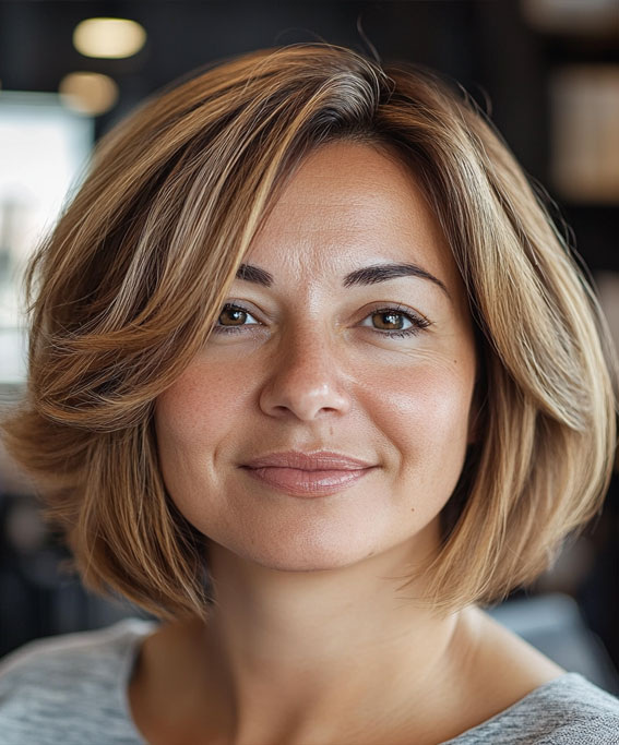13. Объемный многослойный боб - классический и лестный выбор для полных лиц, предлагающий мягкость и движение благодаря искусно выполненной многослойной стрижке. Золотистые светлые пряди добавляют тепло и глубину, придавая стилю солнечный, яркий вид. Мягкие волны создают полноту, в то время как косая челка помогает обрамить лицо, делая его более сбалансированным и определенным.