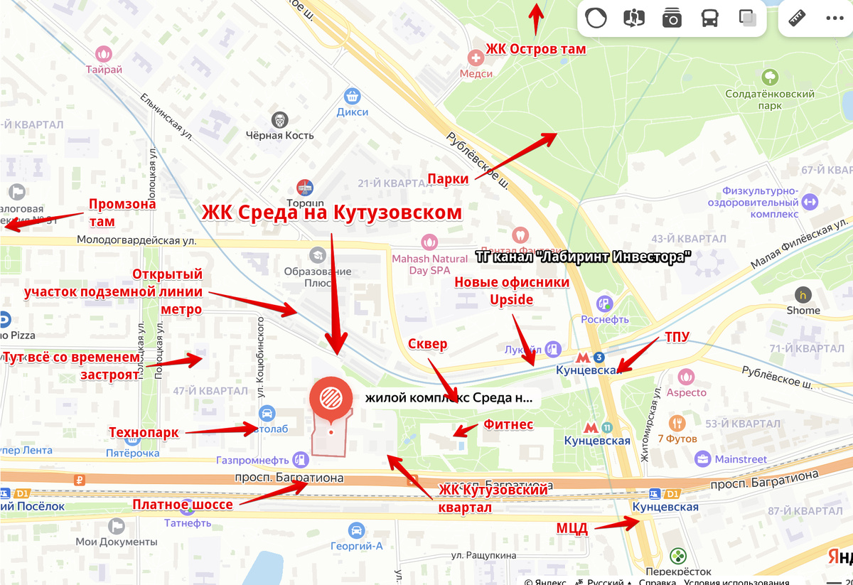 ЖК «Среда на Кутузовском», застройщик SREDA (ПИК), адрес: Москва, ул. Ивана Франко, 4с15. Бизнес-класс, отделка «ватбокс». Метро «Кунцевская» 10 минут пешком, выдача ключей до: 06.2028. Текущие цены от: Студии (23 м2) — 11,6 млн руб. ЕВРО-2 (34 м2) — 16,3 млн руб. ЕВРО-3 (55 м2) — 21,6 млн руб. ЕВРО-4 (72 м2) — 28,3 млн руб. Что хочется людям? Да не так уж и много на самом деле. Люди хотят жить в тихом, зеленом, обжитом районе, рядом с метро, недалеко от центра, без ТЭЦ, ЛЭП, кладбищ и промзон. Согласны? Я вот с этим согласен. Поэтому со всей ответственностью могу сказать, что эта часть района «Кунцево» практически полностью соответствует этим критериям и не так уж и плоха для жизни. Я даже больше того скажу: здесь в целом всё отлично, правда, есть нюанс и даже не один. Но об этом ниже. Во-первых, отмечу отличную транспортную доступность. Ибо рядом ТПУ «Кунцевская» с двумя ветками метро, плюс БКЛ, плюс МЦД-1, плюс аэроэкспресс в Шереметьево. Во-вторых, важно не только расстояние до мет