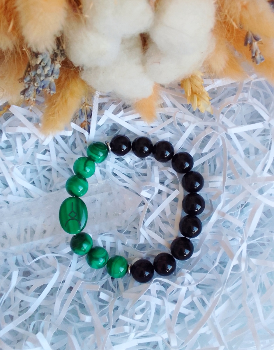 Браслет состоит из натуральных камней малахит, чёрный агат и руны «Целенаправленность». Русская руна «Целенаправленность» представляет собой ориентир деятельности человека, направляя все действия на достижение поставленных целей, конкретных намерений, исполнения желаний. Часто сам путь к реализации задуманного позволяет решить проблемы человека – в этом и есть предназначение руны. Она ведёт человека по пути его кармического предназначения, выводя его сознание на новый, совершенный уровень развития. Руна «Целенаправленность» способна помочь направить течение энергии, вернуть энергию, которую у человека забирают недоброжелатели, а также привлечь людей, необходимых для осуществления цели. Малахит - камень, который как магнит, притягивает деньги, клиентов и возможности. Издавна считался символом исполнения желаний. Он привносит в жизнь своего владельца спокойствие, гармонию и равновесие, позволяя преодолевать жизненные вызовы с лёгкостью и оптимизмом. Малахит дарит человеку увереннос