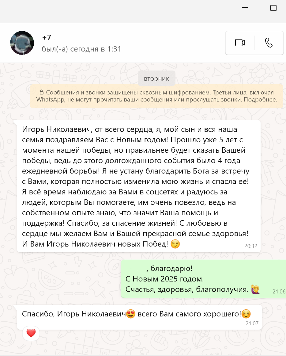 "Игорь Николаевич, от всего сердца, я, мой сын и вся наша семья поздравляем Вас с Новым годом! Прошло уже 5 лет с момента нашей победы, но правильнее будет сказать Вашей победы, ведь до этого долгожданного события было 4 года ежедневной борьбы!