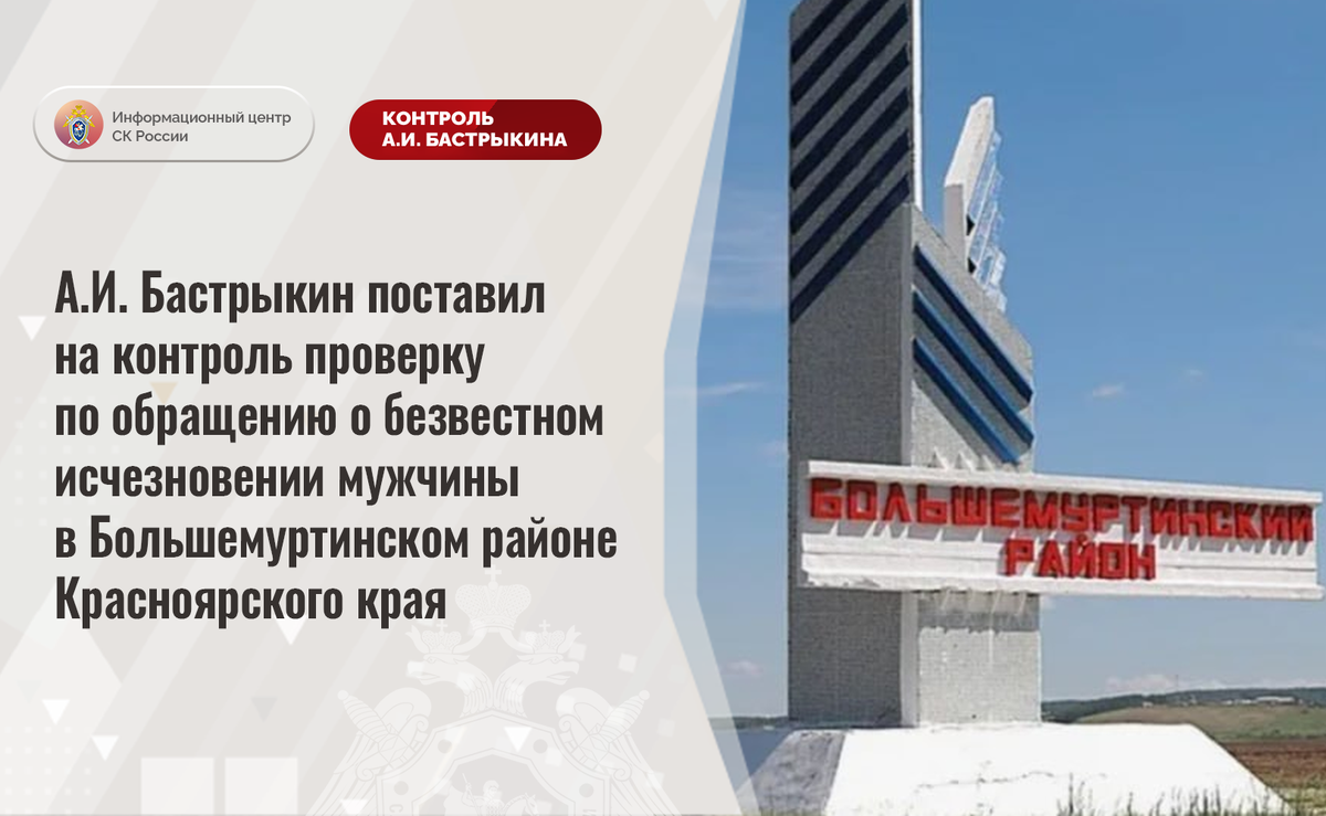 А.И. Бастрыкин поставил на контроль проверку по обращению о безвестном исчезновении мужчины в Большемуртинском районе Красноярского края В приёмную Председателя СК России А.И. Бастрыкина «ВКонтакте» поступило обращение о безвестном исчезновении мужчины в Большемуртинском районе Красноярского края, занимающего должность геолога в одной из коммерческих организаций. Сообщается, что в начале декабря прошлого года он проследовал в лесной массив для установки специализированных меток, однако до настоящего времени его местонахождение не установлено. В ГСУ СК России по Красноярскому краю и Республике Хакасии по поступившему обращению начата процессуальная проверка. Председатель Следственного комитета Российской Федерации Александр Иванович Бастрыкин поставил ход процессуальной проверки на контроль в центральном аппарате ведомства и поручил руководителю ГСУ СК России по Красноярскому краю и Республике Хакасии Алексею Леонидовичу Еремину представить доклад о ее промежуточных результатах и принят