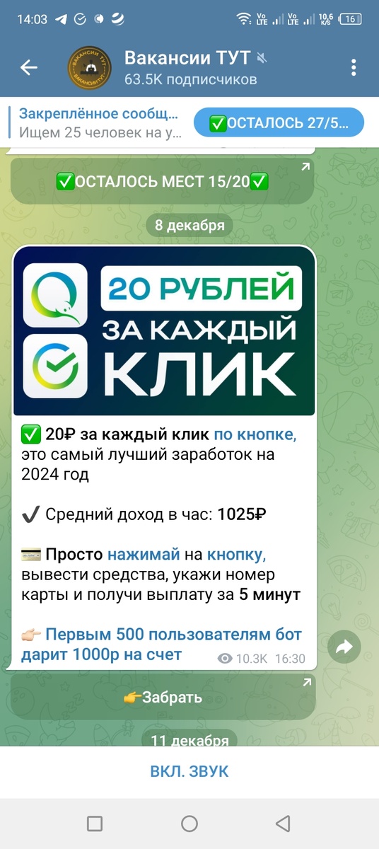 Уже не помню, как в моем Телеграме появился канал Вакансии тут, где только не искала подработку, кто-то предложил - я подписалась))). Долгое время туда не заглядывала и вот пришел его час! Полистала вакансии и наткнулась на заманчивое предложение - 20 рублей за каждый клик! да еще и первым 500 пользователям 1000 рублей! Сразу скажу, что в первые я не попала, 1000 никто на счет не перевел). Зато расклад далее был еще интереснее...