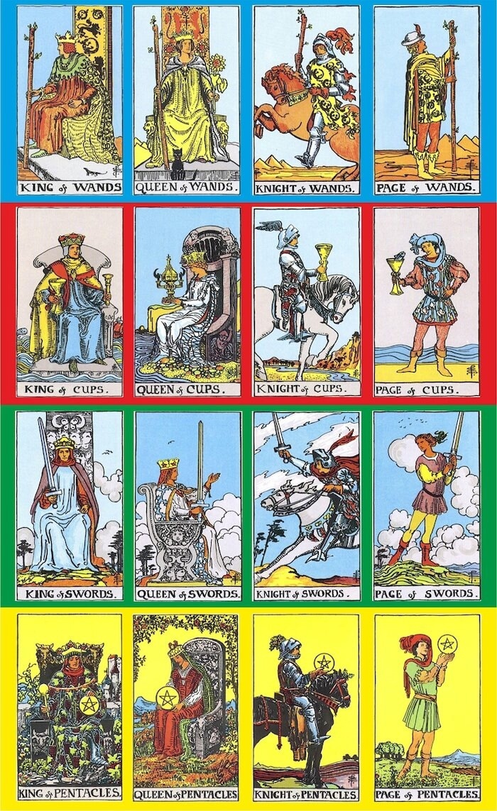 Каждая из четырёх мастей Таро — Жезлы, Кубки, Мечи и Пентакли — включает по 4 Придворных Аркана:
