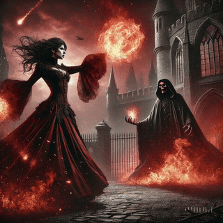 Воздух вокруг наполнился магией, и битва разразилась с небывалой силой. Огненные шары пронзали воздух, взрываясь на каменной мостовой, а молнии, сверкая, резали тёмное небо, освещая лица сражающихся. Каждое заклинание наносило урон окружающему миру: трескались каменные плиты, огонь выжигал землю, оставляя обугленные пятна, а молнии раскалывали валуны, разбрасывая их в стороны. Взрывы раскидывали обломки, которые звенели, падая в тишину перед следующим ударом. Вероника, сосредоточившись, отбивала удары, создавая вокруг себя защитные сферы, которые вспыхивали ярким светом при каждом столкновении с вражескими заклинаниями. Её контратаки были безжалостными: она бросала огненные шары, которые мгновенно превращали одного за другим магов Филипиона в пепел.