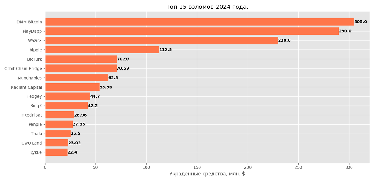 Самым большим взломом 2024 года оказался взлом японской криптовалютной биржи DMM Bitcoin, произошедший в мае. Хакеру удалось получить доступ к приватным ключам DMM Bitcoin, что привело к краже 4,502.9 BTC(305 млн. $ на момент взлома). К сожалению, биржа так и не смогла оправиться после данного взлома, и уже в декабре 2024 года было объявлено о закрытии проекта.